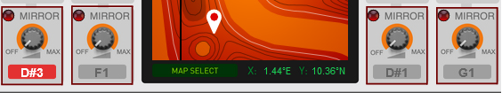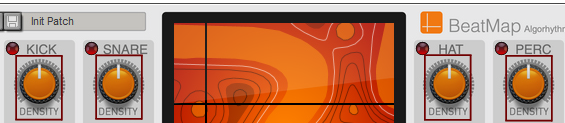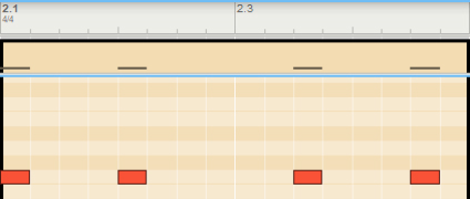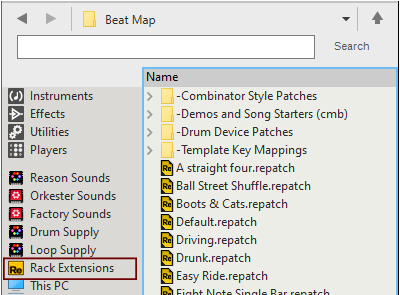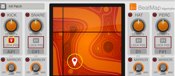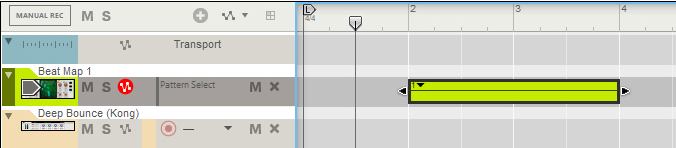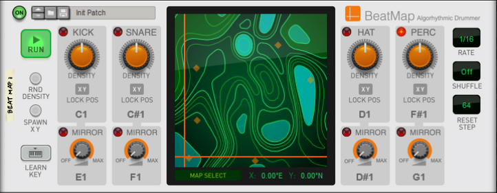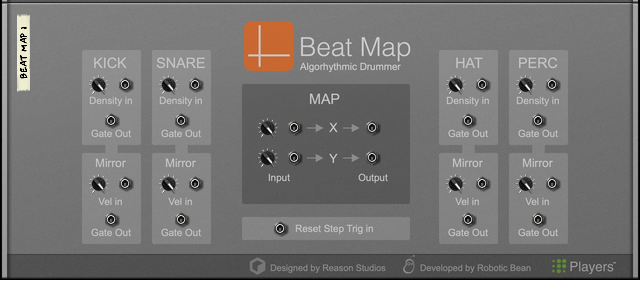 Beat Map The Beat Map Algorhythmic Drummer is a Player that generates drum patterns based on built-in beats, algorithms and simple but powerful controls. It's normally used with a drum instrument such as Kong, Rytmik or Umpf, but can also be used with melodic instruments for interesting results. Included content To browse the content of Beat Map, click "Rack Extensions" in the Browser and then double click the Beat Map folder: Beat Map comes with a number of patches, both for the Player itself and for several different drum devices. The drum device patches are tailored to work well with Beat Map, but you can of course use any patch from the Factory Sound Bank, or make your own. If you want immediate results, start by loading one of the patches in the Combinator Style Patches folder! These combine Beat Map with drum devices and effects for instant rhythmic goodness. If you want a taste of what can be done with multiple Beat Maps in combination with other devices, check out the Demos and Song Starters folder. Note that some of the combi patches use Rack Extensions included with Reason Suite. Finally, the Template Key Mappings folder contains Beat Map patches where the keys (note numbers) have been adapted for other drum configurations such as GM, Reason Drum Kits and various 3rd party drummers. The front panel The central item on Beat Map's panel is the Map display. This is where you select a basic rhythm, by clicking and dragging the cross-hair. • The cross-hair position is also indicated with the X and Y position parameters, which you can edit directly if you like. Each integer XY position corresponds to a different beat. The map graphics are there for visual reference and for the nice looks – there is no particular rhythmic significance to the elements on the map. However, as a general rule, moving the position to the right will make the bass drum pattern more syncopated and moving the position upwards will make the snare pattern more syncopated. • Clicking the Spawn XY button drops you at a random position: Map Select 1. Click the Map Select button to show the four included maps: They contain beats in different styles – click on a map to see some info about it in the display. 2. To select a map for use, either double click it or select it and click Map Select again. Density The beats consists of four different rhythmic patterns, for kick, snare, hi-hat and percussion. Once you've found a beat that you like, you can adjust the Density of each drum. This means reducing or increasing the number of notes. Turning Density down to zero will mute that drum. The Density parameters can be automated or CV controlled, for continuous variations. • Clicking the Random Density button to the left will change all four Density controls to random values, useful for live variations: Lock Position You may find a beat where for example the kick is perfect, but not the other drums. Then you can click Lock Pos for the kick. This will put a "pin" on the map – the kick beat will stay at this position but you can continue exploring the map for the other instruments. This can be done independently for all four drums, locking them to different map positions. This way you can combine rhythms from different basic beats, for infinite variations. You can still adjust Density for locked drums. Mirror notes Each of the four drums has a "Mirror" function, which plays a note in between two note positions from it's main drum. For example, if the kick beat plays like this: ... then its Mirror notes (dark red) will play like this: This means that the Mirror notes will be affected by the Density of the main drum, creating interesting counter-rhythms or ghost notes. Use the Mirror knobs to set the velocity (typically level) of the Mirror notes. Turning the knob down completely will turn off the Mirror note. Setting MIDI note numbers Each drum and Mirror function sends out notes on a separate MIDI note number, meaning that Beat Map can control eight different drum sounds. • Clicking the red signal LED for a drum will send out that note, for quick auditioning of drum sounds: The Perc drum sends out MIDI Note F#1 • You can set which note a drum should send by clicking and dragging the note number on the panel: Alternatively, use the Learn function: 1. Click Learn Key: 2. Click the note number value for a drum or Mirror to highlight it. 3. Play the desired note on your MIDI controller. 4. Repeat for the other notes. 5. Click the Learn Key again to exit Learn mode. This is required for the changes to stick when you save the patch or song. Global settings To the right are three settings that affect the overall playback: • Rate is the note value of each step. Normally this is set to 1/16th notes. • Shuffle allows you to add a swing feel to the beats by delaying the offbeat 1/16th notes. You can set it manually from 50-75% or select “Global” to use the Global Shuffle setting (found in the Groove mixer in Reason). • Reset Step determines the number of steps before the beat starts over from the beginning. The default is 64, but it can be useful to lower this to make a beat less varying or to impose some structure on a chaotic rhythm. Beat Map and the sequencer You can click the Run button manually for auditioning the beat, but the Run function is normally controlled by the Play function in the main sequencer. However, if you want Beat Map to play in certain parts of your song but not in others, it's also possible to control this using Pattern automation. Here's how to do this in Reason: 1. Right-click Beat Map and select “Create Track”. This creates a sequencer track for the Beat Map device. 2. With the Beat Map track selected, click the Create Pattern Lane button above the track list This creates a Pattern lane on the Beat Map track. Since there are no pattern clips on the lane, Beat Map will be stopped. This will be indicated in the map display: 3. Draw pattern clips in the sections where you want Beat M
