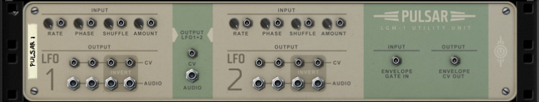 Modulation inputs and outputs LFO 1&2 input sections Rate Use this for dynamically modulating the Rate of the corresponding LFO. Attenuate the input signal with the knob. Phase Use this for dynamically modulating the Phase of the corresponding LFO. Attenuate the input signal with the knob. Shuffle Use this for dynamically modulating the Shuffle amount. Attenuate the input signal with the knob. Amount Use this for dynamically modulating the Level of the corresponding LFO. Attenuate the input signal with the knob. LFO 1&2 output sections CV There are two CV signal outputs for each LFO, plus two additional outputs for the CV signal phase inverted. Audio There are two Audio signal outputs for each LFO, plus two additional outputs for the Audio signal phase inverted. The difference between the Audio outputs and the CV outputs is that the signals on the Audio outputs have higher quality for use in e.g. audio processing applications. Output LFO 1+2 CV There is one CV signal output for the LFO 1 and 2 signals summed with each other. Audio There is one Audio signal output for the LFO 1 and 2 signals summed with each other at audio quality. Envelope connections Envelope Gate In A CV signal with a value > 0 present on this input will gate the Envelope (see “Envelope”). When the CV input signal decreases to zero or below, the gate is opened (deactivated). Envelope CV Out There is one CV signal output for the Envelope signal.