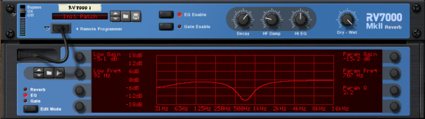 The equalizer in RV7000 Mk II affects the wet reverb sound only and is used for shaping the character of the reverb. There are two EQ bands, one for low frequencies (shelving) and one full-range parametric EQ.