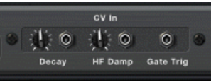 CV Inputs On the back of the RV7000 Mk II you find three CV inputs. These are: | Parameter | Description Decay Controls the reverb decay or echo/delay feedback via CV. HF Damp Controls the HF Damp parameter on the main panel. Gate Trig Used for triggering the Gate section with a gate signal. The length of the gate signal determines the length of the gated reverb. Using the CV inputs to modulate the RV7000 Mk II in Convolution mode is not recommended.
