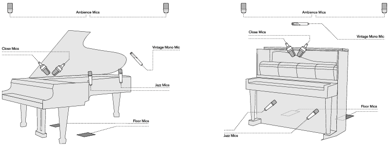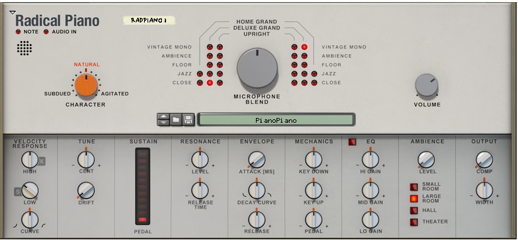 Radical Piano Introduction Radical Piano is designed to be a straightforward, awesome sounding and very flexible piano. Radical Piano combines sample playback technology with physical modeling to give you great sound quality and seamless dynamic response as well as great freedom to tweak your sounds. The combination of sample playback and physical modeling also makes it possible to keep each piano sound set down to a minimum size. This allows for very quick loading times when you switch between instruments. Radical Piano also features sympathetic resonance, which means that any undamped strings will ring along with the played notes (strings), just like on acoustic pianos. This makes Radical Piano sound extremely realistic and alive. There are also a number of other controls for further shaping the sound the way you want it. As a bonus, we also included an audio input so you can route external audio and process it in Radical Piano! The pianos Radical Piano holds complete sound sets recorded from these three pianos: • Home Grand A Bechstein grand piano with a nice “not perfectly tuned” home grand character. • Deluxe Grand A Steinway Model D grand piano - one of the greatest grand pianos out there. This particular one belongs to Sveriges Radio (Swedish Radio Ltd). • Upright A Futura upright piano with a distinct “living room” character. The microphone configurations The microphone configurations for the grand pianos and the upright piano respectively. The pianos were recorded using up to nine microphones per instrument, placed at various critical positions inside and outside of the pianos. The different microphone recordings were then stored in Radical Piano as separate sound sets. The following microphone configurations were used: • Vintage Mono A single microphone placed outside the waist of the grand piano (or behind the upright piano). For the Steinway grand piano we used an old school mono ribbon mic with vintage characteristics and a narrow frequency response with the emphasis in the mid range. For the Futura upright piano we used a vintage tube microphone. • Ambience Two microphones in AB configuration* placed quite far away from the piano to capture the room ambience. • Floor Two pressure zone microphones that lay flat on the floor just behind the front legs of the grand piano (and behind the upright piano). They add depth and richness to the sound and are best used as a complement to the other mics. • Jazz Two microphones in AB configuration* placed just outside/in front of the piano. This gives a full bodied sound with a wide stereo image and a less pronounced attack. • Close Two microphones in XY configuration** placed close to the hammers. The close mics produce a distinct sound with a sharp attack, ideal for uptempo pop/rock. * AB configuration: Two mics in stereo configuration placed several feet apart and tilted slightly away from each other. ** XY configuration: Two mics in stereo configuration placed close together in 'V' shape at a 90° coincidence.