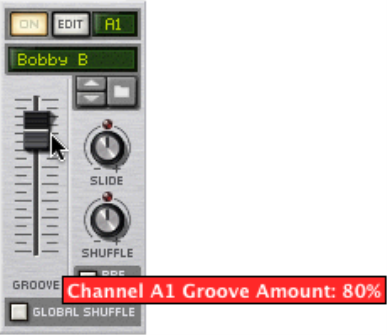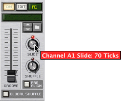 This is useful for comparing with the original, ungrooved beat. If you want to do this for several note lanes set to a particular ReGroove channel, use the “On” button for the channel in the ReGroove mixer instead (see “On Button”).