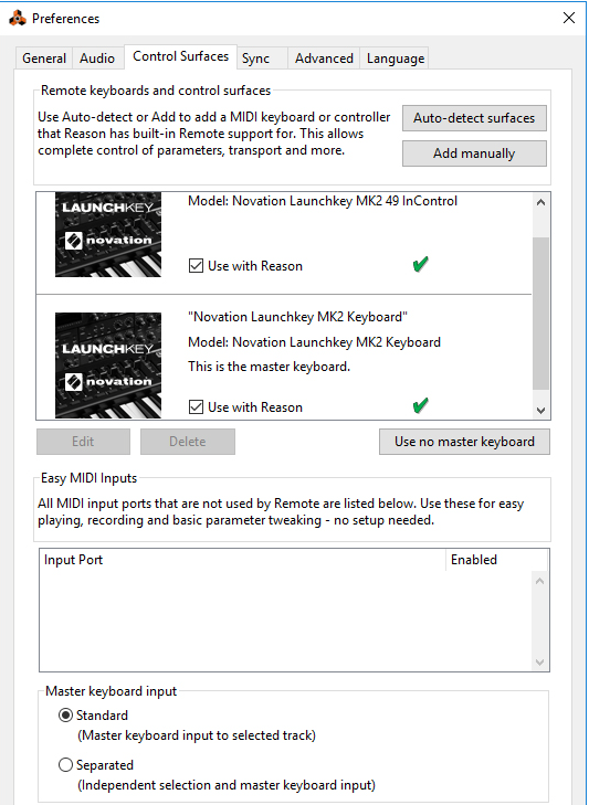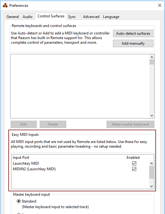 By default Reason automatically scans and detects all available MIDI In port(s) on your computer. If you have a MIDI keyboard or MIDI control surface connected to your computer, Reason automatically connects and lets you use it for controlling Reason. This way you don’t have to do any manual set-up but can start controlling Reason right away.
