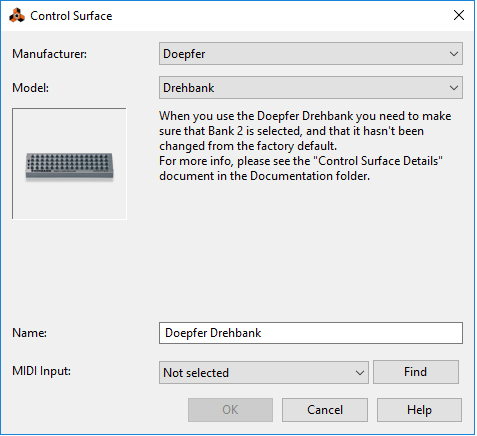 If you can’t find your control surface listed on the Manufacturer or Model pop-up menus when you try to add it, this means that there’s no native support for that model. However, the program supports generic keyboards and controllers. These alternatives might be more useful than the Easy MIDI Input alternative described earlier - if you have a control surface (or keyboard with knobs/buttons/sliders) that you want predefined parameter destinations for. Here’s what to do: