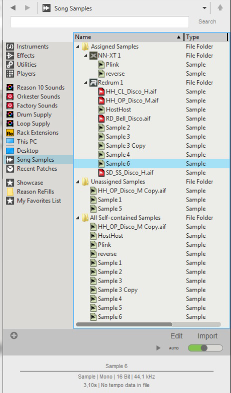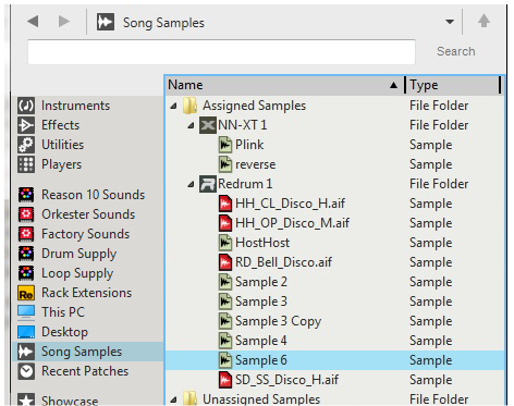 4. Here, all samples you use in your song are listed (see “The Song Samples location”). Here is also where you can open samples for editing (see “Editing samples”).Here, all samples that are assigned to devices in the song are listed. All devices that contain assigned samples are listed as “sub-folders”. Each device “sub-folder” shows the samples currently assigned to it. See “Assigned Samples” for more details.If you remove a sound you have sampled from a device, the sound is automatically moved from the Assigned Samples folder to the Unassigned Samples folder. From here you can load the sample into other devices if you like. See “Unassigned Samples” for more details.All sounds you have sampled yourself, plus any duplicated samples from the Factory Soundbank and/or ReFills, automatically becomes self-contained and are always stored with the song. These samples are listed in the All Self-contained Samples folder. See “About self-contained samples” for more details.Click the Edit button to open the selected sample for editing in the Edit Sample window (see “The Edit Sample window”).Select this to open the sample for editing in the Edit Sample window (see “The Edit Sample window”). If several samples are selected, this item is grayed out.Select this to create a duplicate of the selected sample. The duplicated sample is placed in the All Self-contained Samples and Unassigned Samples folders. Several selected samples can be duplicated in one go. See “Duplicating samples” for more details.Select this to export the selected sample to disk. A dialog appears where you can select file format. Note that it is not possible to export samples from the Factory Soundbank or from ReFills. Several selected samples can be exported in one go. See “Exporting samples” for more details.Select this to permanently delete the selected sample(s) from the song. Note that samples from the Factory Soundbank and from ReFills will not be deleted from their original locations - only from the song document. Several selected samples can be deleted in one go. See “Deleting samples from a song” for more details. Any samples you have recorded yourself will be permanently erased unless you have previously exported them to disk (see “Export Sample(s)” below).