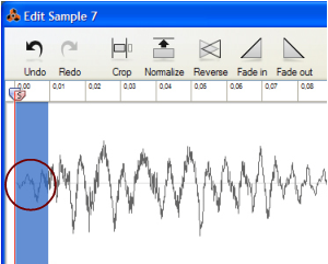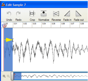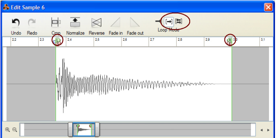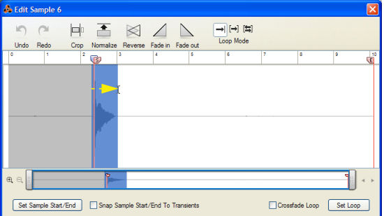 Click the Crop button to crop the sample so that only the content between the Start (S) and End (E) locators is preserved. The rest of the sample will be permanently deleted. See “Cropping samples” for more info.Click the Normalize button to amplify the entire sample so that the loudest peak touches 0 dB. Note that the entire sample is normalized, regardless of any locator settings. See “Normalizing samples” for more info.Click the Reverse button to reverse (play backward) the entire sample. Note that the entire sample is reversed, regardless of any locator settings. See “Reversing samples” for more info.The Fade In and Fade Out buttons can be used to apply a fade in or fade out of the sample volume. See “Fading in/out samples” for more info.Click one of the Loop Mode buttons to select loop type. The default (leftmost) setting is “no loop”. Then follow “Loop Forward” and “Loop Forward + Backward”. See “Looping samples” for more info.Below the waveform pane is the horizontal Waveform Navigator. This can be operated in the same way as the Song Navigator in the sequencer (see “Scrolling with the Navigators and scrollbars”, “Zooming horizontally in the Sequencer” and “Scrolling and zooming using a wheel mouse”).Set the desired sample playback region by clicking and dragging on the waveform pane. Then, click the Set Sample Start/End button to automatically place the Start and End locators at the beginning and end of the sample region. See “The Set Start/End function” for more info.Tick the Crossfade Loop box to introduce a crossfade in the loop. Crossfade is useful to even out any clicks in the loop points, especially for sounds with fairly even volume throughout the loop region. See “The Crossfade Loop function” for more info.Set the desired loop region by clicking and dragging on the waveform pane. Then, click the Set Loop button to automatically place the Left and Right Loop locators at the beginning and end of the loop region. See “The Set Loop function” for more info.