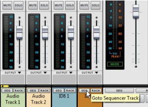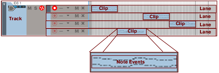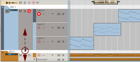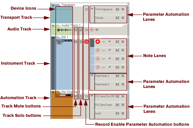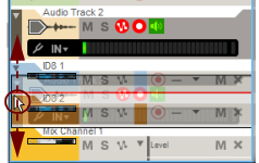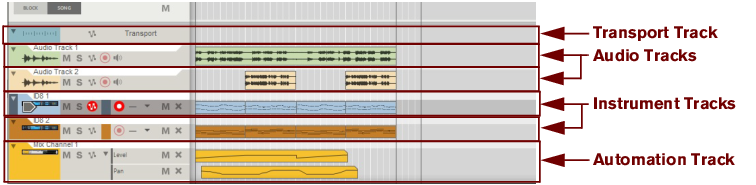 • Only one track at a time can have Master Keyboard Input. However, if you have locked additional MIDI keyboards to specific devices in the rack via Remote (see “Locking a surface”), you will be able to play and record these together with the track that has Master Keyboard Input.The Blocks track is present at the top of the Track List only when the Enable Blocks function on the Options menu is on. On the Blocks track you can create Block Automation clips to decide which Blocks should play back. Refer to “Working with Blocks in the Sequencer” for more information about the Blocks feature.The Transport track is always present at the top of the Track List and cannot be moved or deleted. The Transport Track can have a maximum of two lanes: one containing time signature automation, and the other containing tempo automation. See “Automating time signature” and “Editing tempo automation” for more details.An audio track can only have a single audio lane containing clips with mono or stereo audio recordings. However, each audio clip can contain several recordings, i.e. different "takes". You can view and comp these takes in the Comp Editor. See “Audio Editing in the Sequencer” for more details. An audio track can also have parameter automation lanes containing automation for the Audio Track Channel strip parameters in the Main Mixer.By default, the audio track is set up in mono. You can easily change to stereo by selecting “Stereo Input” in the “Audio Input” drop-down list - see “Selecting audio input(s) and defining mono or stereo”. If you select “Stereo Input”, the Audio Track channel strip in the Main Mixer automatically switches to a stereo channel.