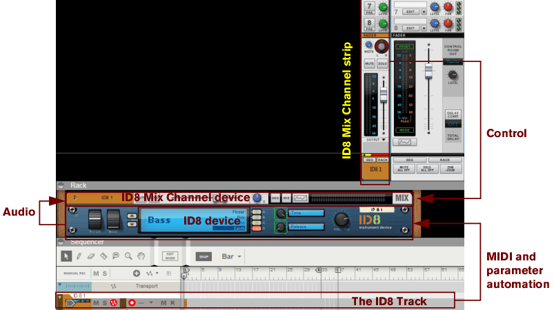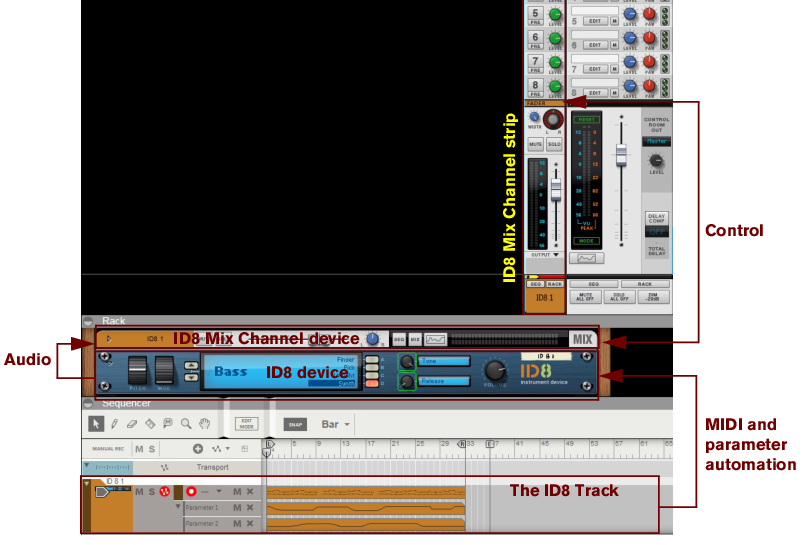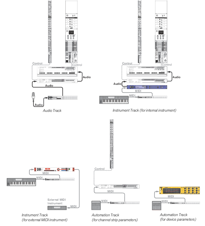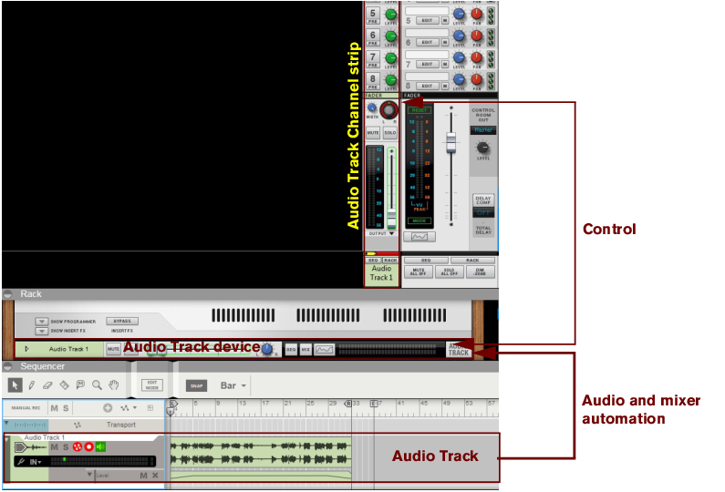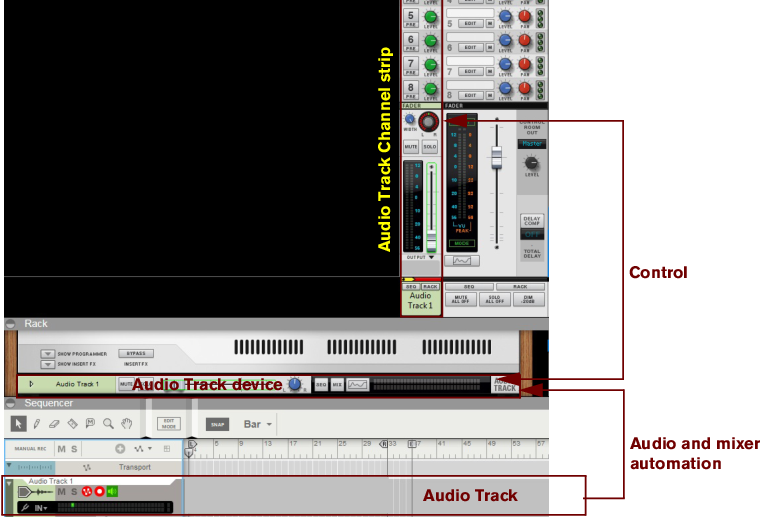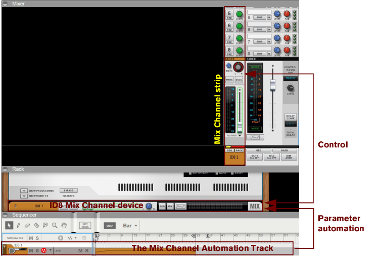 Note that when you create an instrument, the connected Mix Channel device doesn’t automatically get a track in the sequencer. If you want to record Mixer Channel automation, you have to first create a separate sequencer track for the Mix Channel device. See “Automation (non-instrument) track relationships”.If you want to control an external MIDI instrument from the Reason sequencer you have to use the MIDI Out Device (see “MIDI Out Device”). The device works as a MIDI router in which you can define which MIDI Out Port and MIDI Channel you want the MIDI signals to be sent to from Reason. Since there is no internal audio involved in this setup, there is no Audio Track device or Mix Channel device present in the configuration.A pure automation track is always associated with a “non-instrument” device, i.e. a device which can’t receive MIDI Note information. Consequently, an automation track can only consist of parameter automation lanes. Examples of non-instrument devices are Mix Channel devices with their corresponding Mix Channel strips, effect devices, mixer devices and Spider Merger & Splitter devices. The picture below shows an example with an automated Mix Channel:The standard way of routing MIDI from a connected MIDI master keyboard or control surface to a device in the rack is to set the Master Keyboard Input in the sequencer. When MIDI is routed to a selected track in the sequencer, the notes and controller data are automatically echoed to the associated device in the rack. However, it is also possible to set Master Keyboard Input from the rack, see “Playing devices from the rack”.By locking additional MIDI keyboards to separate devices in the rack, you will be able to play and record on several sequencer tracks simultaneously, see “Locking a surface”.Besides the standard routing described above, it’s also possible to lock certain rack devices to specific control surfaces. See “Locking a surface” for more details.It’s also possible to set Master Keyboard Input and track selection independently from each other by selecting “Separated” on the “Keyboards and Control Surfaces” page in Preferences - see “Preferences – Control Surfaces”.