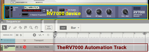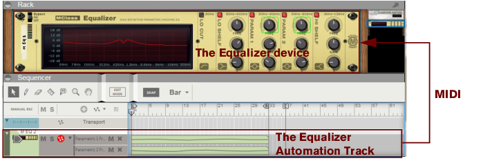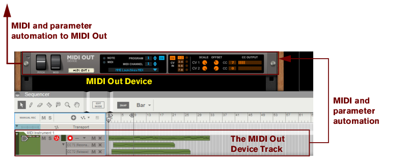 A MIDI Out Device is created in the rack and the associated track is automatically created in the sequencer. See “MIDI Out Device” for more details on how to configure the MIDI Out Device for controlling external MIDI instruments.For non-instrument devices, such as effects devices and Mix Channel devices, you need to manually create a track if you want to record parameter automation. You can do that either by following the description below or by following either of the two last descriptions in “Creating/adding parameter automation lanes”.