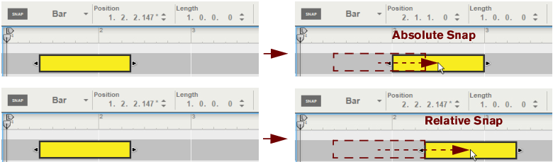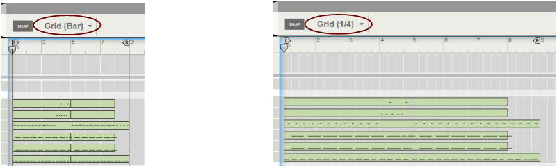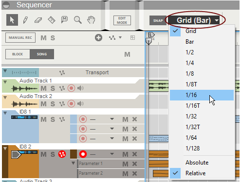However, there’s one exception: If a note clip is open in Edit Mode and you click in the Clip Overview (see “Edit Mode elements”), the clip will remain open but the Snap value for arranging will be selected. This allows you to e.g. move or resize the clip in the Clip Overview just like in the Song/Blocks View, without closing it first.