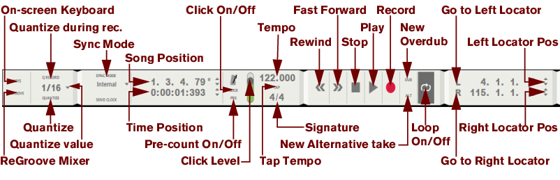 See the “On-screen Piano Keys” chapter for more information.Refer to “The ReGroove Mixer” chapter for more information.When the Q Record button is on, all recorded MIDI notes will be quantized to the currently selected quantization grid. Refer to “Quantize” for more information on quantization.Refer to “Quantize” for more information on quantization.Refer to “Quantize” for more information on quantization.Here you can set the desired synchronization mode for the Reason sequencer: Internal, MIDI Clock (if applicable) or Ableton Link (if applicable). You can also choose “Send MIDI Clock” to sync other applications/instruments from Reason (if applicable). See the chapter “Synchronization and Advanced MIDI” for more information about synchronization.The current song position is shown in the display. The song position is where the Song Position Pointer in the Ruler (see Ruler details) is at the moment. The display is divided into Bars, Beats, 1/16th Note and Ticks (there are 240 Ticks for each 16th note) segments. You can edit the position of the Song Position Pointer, and thus change the song playback position, according to the descriptions in “Transport Panel segment displays”.The current position of the Song Position Pointer in the Ruler (see Ruler details) is shown in time format (hours, minutes, seconds and milliseconds) in the display. You can change the position in time of the Song Position Pointer, and thus change the song playback time position, according to the descriptions in “Transport Panel segment displays”.The click will sound on every beat, with the first beat in every bar accented (higher pitched). See “Click and Pre-count” for more details.Pre-count will only be present before recording - not before regular playback. See “Click and Pre-count” for details about selecting number of pre-count bars etc.See “Click and Pre-count” for more details.The current song tempo is shown in the display in BPM (Beats Per Minute) and 1/1000 of a BPM. You can edit the tempo according to the descriptions in “Transport Panel segment displays”. The Tempo range is 1.000-999.999 BPM.The current song time signature is shown in the display. You can edit the time signature according to the descriptions in “Transport Panel segment displays”.