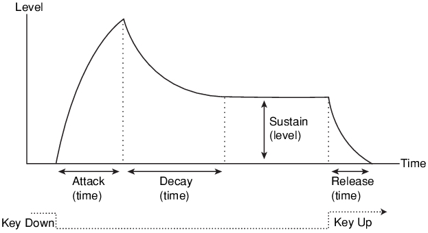Standard synthesizer envelope generators have four parameters; Attack, Decay, Sustain and Release (ADSR).