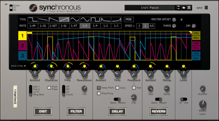 Synchronous Timed Effect Modulator Introduction The Synchronous Timed Effect Modulator device is a very flexible multi effect “loop” device with freely designable effect parameter modulation curves. Synchronous features built-in Distortion, Filter, Delay and Reverb effects that can be modulated simultaneously by up to three modulation curves. By drawing your own unique modulation curves in the display and assigning these curves to the desired effect parameters, you get a very flexible system for repeatedly modulating the effects parameters - in perfect sync with the Reason sequencer. The standard loop length is 2 bars. However, if you run Synchronous in half speed, you will get a maximum loop length of 4 bars. Synchronous is designed to be used mainly as an insert effect, on individual tracks, or as a “loop mangling” effect hooked up to the outputs of a Dr Octo Rex or Redrum device, for example.