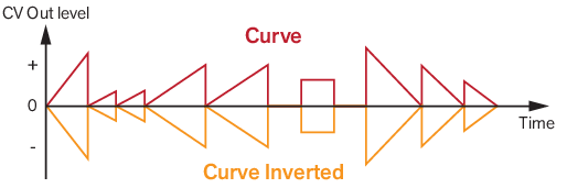 The “Inverted” CV outputs below each “regular” CV output send out inverted negative unipolar control signal levels according to the shapes of Modulation Curves 1-3 respectively.