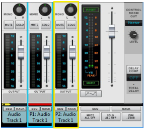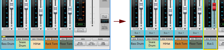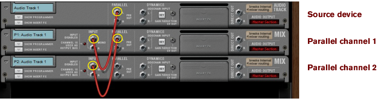 Parallel Channels A very flexible way of working with insert effects is to use parallel channels that host the effects, while keeping the dry signal of the source channel intact. This way you can freely control the levels of the dry signal and the separate effects - and also control the sound of each effect individually from each of the parallel channels. You could, for example, have one parallel channel with a compressed distortion effect, another parallel channel with a Delay, and so on. Then, you can freely EQ the effects in each of the parallel channels, as well as control their levels individually from each Fader. Creating Parallel Channels Parallel channels can be created as follows: 1. Select the source Mix/Audio Track channel strip in the Main Mixer, or its device in the rack. 2. Select “Create Parallel Channel” from the Edit menu or context menu. A new Mix Channel is created and placed to the right of your original channel in the Main Mixer: A Parallel Channel created for Audio Track 1. The parallel Mix Channel is automatically named “P1: <source channel name>” and its channel header is colored according to the source mixer channel header. Both the source channel and the parallel channel also get shorter channel headers to indicate they are routed in a parallel configuration. If you want to add more parallel channels to your source channel, select the last created parallel channel and select “Create Parallel Channel” from the Edit menu or context menu. This adds another parallel channel to your source channel: Another Parallel Channel created for Audio Track 1. In the rack, the Parallel out jack(s) of the source Mix Channel/Audio Track device are automatically connected to the Direct Input jack(s) of the first parallel Mix Channel. The second parallel Mix Channel is then connected to the first parallel Mix Channel, and so on: Parallel Channels 1 and 2 for the Audio Track 1 source channel in the rack. Since the Audio Track/Mix Channel device only has one pair of Parallel out jacks, any additional parallel channels have to be created from the last created parallel channel. If your original channel is in mono, only the left parallel output is connected to the left input of the parallel channel. 3. Now, you can create Insert FX in each of the parallel channels and process the signal of your source channel separately, in parallel. It might also be a good idea to create a separate Output Bus for the source channel and all parallel channels, see “Creating an Output Bus”. Creating a Parallel Output Bus Parallel channels can also be created for Output Bus channels, for parallel processing of the entire Bus signal. The following example shows a drum kit, with a channel for each drum, that we want to assign to an Output Bus and apply parallel compression to: 1. [Shift]-select all drum channels in the mixer. 2. Press [Ctrl]+[G](Win) or [Cmd]+[G](Mac) to create a new Output Bus to automatically route the drum channels to. A new Output Bus channel, named “Bus 1”, is created to the right and the selected channels are automatically routed to it as indicated on the channels’ Output labels. 3. Select the “Bus 1” channel in the mixer and select “Create Parallel Channel” from the Edit menu or context menu. A parallel channel, the “P1: Bus 1” is created and the “Bus 1” Output Bus channel is automatically connected to it. 4. Activate the Compressor in the “P1: Bus 1” parallel channel and raise the Compression Ratio up high. 5. Raise the Level fader on the “P1: Bus 1” channel to gradually introduce the heavily compressed sound (in parallel with the dry signal of the “Bus 1” channel). Deleting Parallel Channels To delete a Parallel Channel, select its mixer channel strip - or its device in the rack - and press [Delete] or [Backspace]. Confirm the deletion in the alert that appears. Naming Parallel Channels When you create a Parallel Channel it is automatically named after its source channel according to: “P1: <source channel name>”, where “P” stands for Parallel and “1” for the first parallel channel. If you add on more parallel channels, the following channels are named “P2: <source channel name>” and so on. If you change the name of the source channel, all the parallel channel are automatically renamed accordingly. You can then manually rename each parallel channel afterwards if you like. To revert to the automatically generated name, double-click the parallel channel’s name, press [Delete] or [Backspace] and then [Enter].