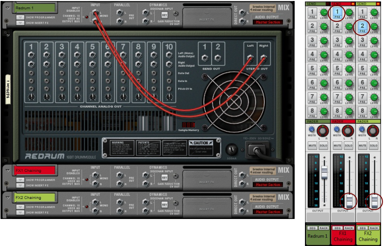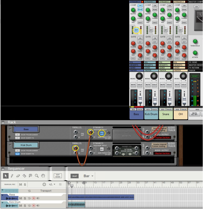 • Use a “Spider Audio Merger & Splitter” device to split the sidechain signal from the Parallel outputs and/or Insert FX “To Device” output into several signals.See “Output Busses” for information.Another typical application for compression sidechaining is to use the internal signal of the channel, filter it, and then feed to the compressor via “internal” sidechaining. This type of internal sidechaining can be used for de-essing, for example. No additional patching is required for this; you only have to activate the “Filters to Dynamics Sidechain” button in the Filter or EQ sections. See “About the Filters To Dynamics Sidechain button”.Direct routing of individual channel outputs to individual outputs on the Reason Hardware Interface.Now, you can begin recording on the Audio Track according to the standard recording procedures described in “General recording procedure”. The signal will be processed by the Insert FX of the Mix Channel device before being recorded on the track.
